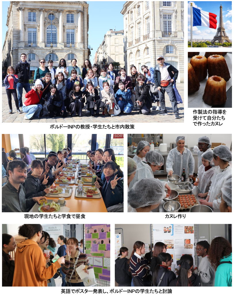 2026年3月後半に10日間の研修旅行を行いました。昨年が初回で、今回が第二回です。本学食物栄養学科の学生16名と教員2名(私と松本晋也教授)でパリとボルドーを訪問しました。ボルドーINP(工科大学)では、ボルドー発祥であるカヌレを作製すると共に市販品との食べ比べを行いました。本学の学生が7班に分かれて、日本の食文化や栄養学的効用などを英語でポスター発表し、INPの教授、松本教授、私がそれぞれの研究成果を講演し、議論しました。ボルドー大学Neurocampusでは神経科学の研究所を見学しました。 INPのClementine教授とその学生がボルドー市内や近郊のワイナリーやチョコレート工場などを案内してくださり、貴重なフランス食文化体験となった上に、現地学生とも密に交流でき、充実した研修旅行となりました。